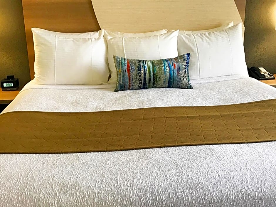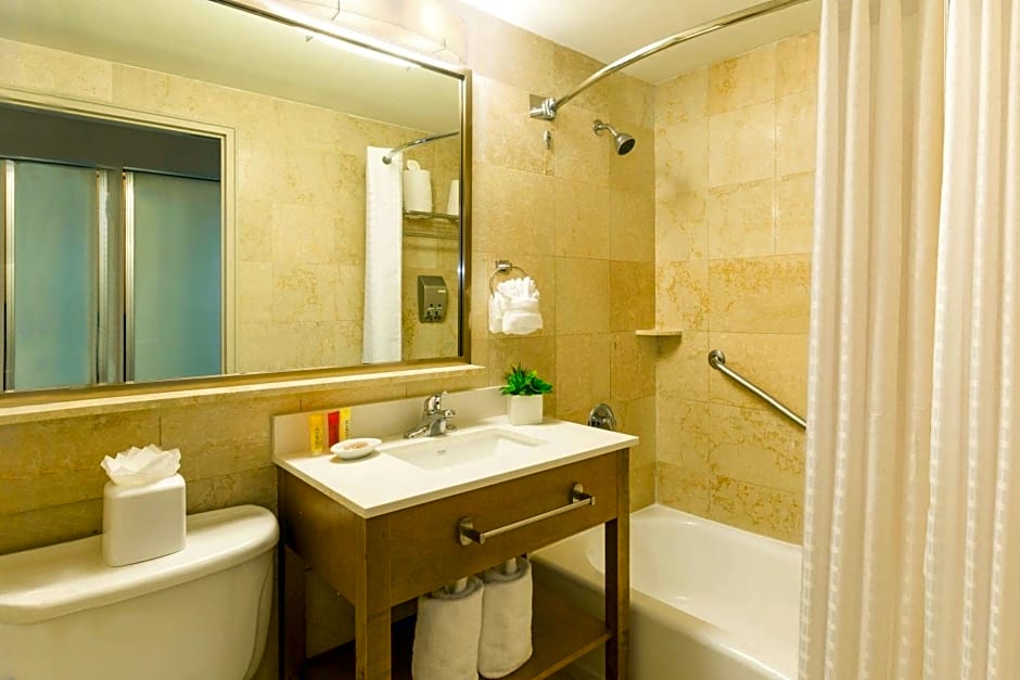 This ergonomically designed accessible room features a coffee machine, 36-inch flat-screen cable TV, and desk. The private bathroom has a roll-in shower.